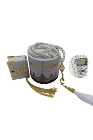 ميني زيليندر مقبضات ميفليت هدية مع كعبه أبيض (قرآن صغير+لؤلؤة تسبيح 99+حجر زيكرمات)