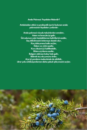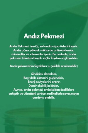 - %100 doğal ve katkısız Andız (Ardıç) pekmezi- sağlığınıza zararlı katkı maddeleri içermeyen bir besin kaynağıdır. - 680 gram ağırlığındaki bu ürün- günlük enerji ihtiyacınızı doğal yollarla karşılamak için idealdir. - Andız (Ardıç) pekmezi- vitamin ve mineral bakımından zengin olup- bağışıklık sisteminizi güçlendirir ve enerji seviyenizi artırır. - Doğal bir enerji kaynağı olan Andız (Ardıç) pekmezi- düşük kalorili yapısıyla diyetinize kolayca entegre edilebilir. - Koruyucusuz formülü sayesinde- doğal lezzetini ve besin değerini korurken tüketim kolaylığı sağlar.