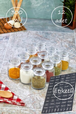 12'li Kapağı Kendinden Kaşıklı Ve Etiketli Baharatlık Seti 300 ml Gold Etiketli Cam Baharat Takımı
