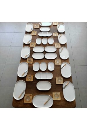 12 Kis?ilik 62 Parc?a Oval Şef Kahvaltı Takımı - 12 Adet 25x15cm Oval Servis Tabag?ı - 12 Adet Bambu Saplı Kahvaltı Bıçağı - 12 Adet Bambu Çay Tabağı - 12 Adet Lav Çay Bardağı - 6 Adet 20x12cm Sıcak tabağı - 6 Adet 12x8cm Sosluk - 2 Adet 3 Bölmeli kahvaltılık