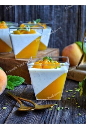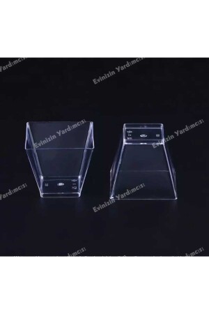 كأس من بلاستيك شفاف في شكل مكعب مع أبعاد 7 سم × 7 سم × 6.5 سم ومحجم 200 سم. هو بديل مختلف ورائق في عرض الأطعمة الخفيفة الم