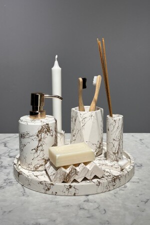 5 Parça Mermer Desen Mat Banyo Seti - Wc Fırçalık- Sıvı - Katı Sabunluk- Çöp Kovası- Diş Fırçalık