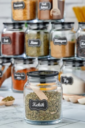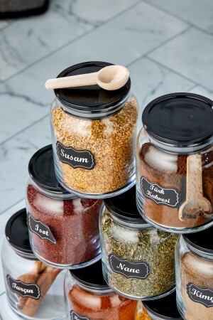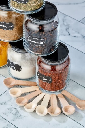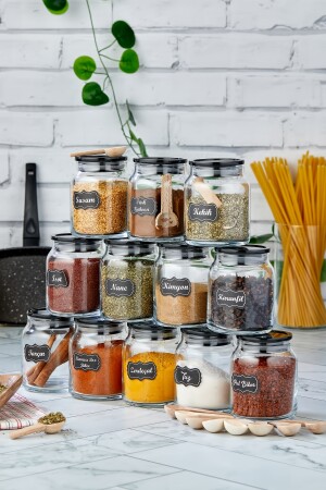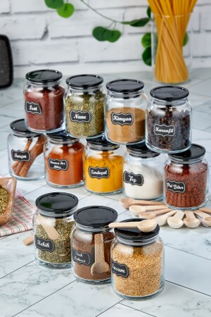 12'li Kapağı Kendinden Kaşıklı Ve Etiketli Baharatlık Seti 300 ml Gold Etiketli Cam Baharat Takımı