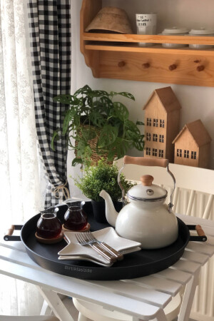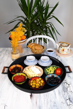 3 Lü (51- 37- 30 CM) Ahşap Kulplu Metal Tepsi Çay Tepsisi Kahve Tepsisi Sunum Tepsi Seti
