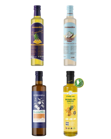 Bu kombine set, doğal içerikler ve bilimsel destekli bileşenler ile formüle edilmiş 4 farklı sıvı takviyesi bir arada sunar. Set içeriği: Hindistan cevizi karışımı (250 ml): Hindistan cevizi sirkesi, chia, kinoa, yeşil çay ve biberiye gibi bileşenlerle zenginleştirilmiş, günlük detox ve metabolizma desteği sunar. İçimi yumuşak, doğal tat profiliyle günlük rutine kolayca uyum sağlar. Kayısı Mix Sirke (250 ml): Yeşil elma sirkesi ve bromelain enzimiyle sindirim desteği, limonla dengelenmiş lezzet ve sağlıklı bir asidik tat sunar. Formülünde lif ve antioksidan içeriği yüksek doğal bileşenler bulunur. Bromelain Ananas Detoks Şurubu (250 ml): Bromelain ve ananas özü bazlı formlu ile sindirimi destekler, ödem atımına yardımcı olur ve günlük detoks ritüelini tamamlar. Bromelain Mix + CoQ10 & L-karnitin (250 ml): Koenzim Q10 ve L-karnitine takviyeli formülü ile hücresel enerji üretimine katkıda bulunur, yağ metabolizmasını destekler ve daha aktif bir yaşam tarzını teşvik eder. Kullanım Önerisi Her şişe 250 ml olarak sunulur. Günde 1 – 2 yemek kaşığı (10 – 20 ml) kadar suyla karıştırılarak tüketilmesi tavsiye edilir. Tercihen sabahları aç karnına veya yemek sonrası alınabilir. Notlar & İpuçları Bu ürünler takviye gılayan dadır, ilaç değildir. Sağlık sorunlar veya hamilelik/emzirme durumunda doktoruna danmayı bırakın. Etkili sonuç için dengeli beslenme ve su tüketimi sunar. Komple doğal detoks formülü – Hindistan cevizi, doğal sirke, bromelain enzimi ve bitkisel karışımlar bir arada sunularak günlük detoks ritüeline güçlü bir katkı sağlar. Sindirim ve Metabolizma Desteği – Bromelain enzimleri ve yeşil elma sirkesi gibi içeriklerle sindirim sistemini dengeler ve metabolizmayı destekler. Enerji & Yağ Yakımına Yardımcı – Koenzim Q10 ve L-Carnitine takviyesi, hücresel enerji üretimini mini destekler ve yağ metabolizması katkı sağlar. Zengin Bitkisel İçerik Profili – Yeşil çay, biberiye, chia, kinoa gibi antioksidanlar bakımından güçlü bileşenler sağlıklı yaşam rutinini sunar: Kullanım kolaylığı & Lezzet – 250 ml'lik pratik cam şişelerde sunulan formüller, su ile karıştırılarak günlük rutine kolayca kullanılabilir.