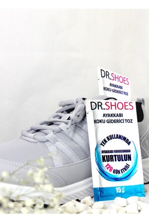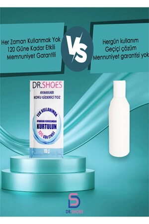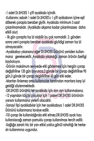 -1 adet Dr. Shoes 1 çift ayakkabı içindir. -Kullanımı sabah 1 adet Dr. Shoes'u 1 çift aykkabının içine eşit dökerek çorapla beraber giyilir.Ayakkabı minimum 5 saat çıkarılmamalıdır.(Ayakkabı akşama kadar çıkarılmazsa daha etkili olur) -İlk gün çorapta toz izi olabilir bu çok normaldir.2. günden sonra yeni çorapla beraber ayakkabı giyildiği zaman toz izi olmayacaktır. -Ayakkabıyı yıkarsanız eğer Dr. SHOES ürününü yeniden kullanmanız gerekecektir.Ayakkabı yıkandığı zaman ürünün özelliği kayboluyor. -Ürünün maksimum seviyede etki göstermesi için hergün çorap değiştirilirse 120 gün boyunca-2 günde bir çorap değiştirilirse 90 gün-3 günde bir çorap değiştirilirse 60 gün etki eder. -Mantarı önlemez ama kullanıcılar tarafından mantara karşı iyi geldiği söylenmektedir. DR. SHOES ürününü her ayakkabı için ayrı ayrı kullanmalısınız. -12 yaşından küçük çocuklar için 1 paket DR. SHOES ürününün yarısını kullanmanız yeterli olacaktır. -Sanayi tipi ayakkabılar için her ayakkabıya 1 adet DR. SHOES ürününü kullanmanız tavsiye edilir. -Tül çorap ile kullanıldığında fayda etmez.DR.SHOES ayakkabı tozu kullanılacağı zaman pamuklu çorap kullanılması tercih edilir. -Sağlığa zararlı hiç bir yan etkisi yoktur-gönül rahatlığı ile herkesin kullanımına uygundur. Ayak ve Ayakkabı Kokusu Sorunlarına Dr. Shoes ile Kesin Çözüm Herkesin başına gelebilecek rahatsız edici sorunlardan biri ayak ve ayakkabı kokusudur. Bu rahatsız edici sorunlar hem sizin hem de çevrenizdekilerin rahatsız olmasına neden olabilir. Dr. Shoes- ayak ve ayakkabı kokusu sorunlarınızı çözmek için tasarlanmış özel ürünleriyle size yardımcı olur. Ayak Kokusu ve Ayakkabı Kokusu Giderici Ürünler Dr. Shoes'un ayak kokusu ve ayakkabı kokusu giderici ürünleri- bu sorunların etkili bir şekilde üstesinden gelmenize yardımcı olur. Ayak kokusuna neden olan bakterileri ve mantarları kontrol altına alır ve ayakkabılarınızın içindeki kötü kokuyu ortadan kaldırır. Ayakkabı Kokusu Giderici Toz ve Krem Seçenekleri Dr. Shoes- ayakkabı kokusu giderici toz ve krem seçenekleri sunar. Ayakkabılarınızı ferahlatmak ve kokusunu gidermek için bu ürünleri kullanabilirsiniz. Ayakkabı içindeki nem ve kokuya neden olan etkenlere karşı etkili bir çözüm sunar. Dr. Shoes: Ayak Sağlığınıza Duyarlılık Dr. Shoes- yıllardır ayak sağlığını ön planda tutan bir markadır. Ürünlerimiz ayaklarınızı korurken aynı zamanda rahatlık ve ferahlık sağlar. Ayak sağlığınıza duyarlı bir yaklaşımla size en iyi ürünleri sunuyoruz. Hemen Dr. Shoes Ürünlerini Keşfedin Dr. Shoes'un ayak ve ayakkabı kokusu giderici ürünlerini keşfedin ve ayaklarınızı ferahlatın. Ayak kokusu ve ayakkabı kokusu sorunlarına son vermek artık çok daha kolay ve etkili. Dr. Shoes Güvencesiyle Dr. Shoes ürünlerine güvenebilirsiniz. Etkili- güvenilir ve ürünler sunuyoruz. Ayak ve ayakkabı kokusu sorunlarına karşı çözüm ararken Dr. Shoes'u tercih edin.