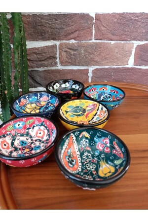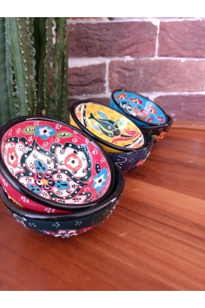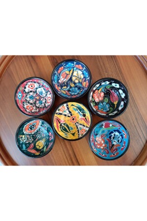 Misafirleriniz sunumlarınıza bayılacak! Tamamen el işçiliği ile yapılmış, her biri birbirinden eşsiz, sık tasarımlı, dekoratif görünümlü seramik çini kase seti.Kahve ve sohbetlerinize eşlik edecek sunum kasesi, kahvaltılıklarınız, soslarınız, reçelleriniz için şık bir servis kasesi, ayrıca özel günlerinizde hediye etmek için hediyelik set, kına kasesi, nikah şekeri kasesi gibi çok çeşitli kullanım alanı sunar.8 cm çapında, 4 cm yüksekliğinde, 6 adet farklı renkte olan bu sevimli kaseler bulaşık makinesinde yıkanabilir, fakat hassas olarak el işçiliği uygulandığı için elde yıkama tavsiye edilir. Desenleri ve canlı rengini uzun süre korur.