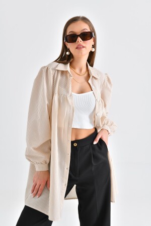 Maße des Modells: Größe: 1,73 – Brust: 85, Taille: 70 – Hüfte: 95, Länge von der Schulter bis zur Vorderseite: 90 cm. Das Produkt des Modells hat Größe S/36. 85 % Polyester, 10 % Baumwolle, 3 % Viskose, 2 % Elastan, knitterfrei, leicht, bequem, hält kühl, schwitzt nicht