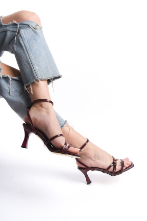 Burgunderrote Damenschuhe aus Lackleder mit Absatz und Gürtelschnalle