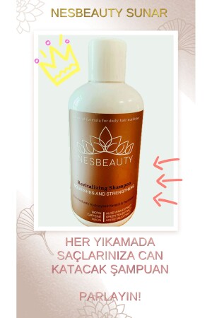 NESBEAUTY Revitalizing Shampoo 250 ml Saçlarınızı NESBEAUTY’nin Keratin & Panthenol ile zenginleştirilmiş şampuanıyla besleyin ve güçlendirin! Lüks segmentteki bu Canlandırıcı Şampuan- saçlarınıza derinlemesine bakım yaparak onları besler ve güçlendirir. Hidrolize Keratin ve Panthenol ile zenginleştirilmiş formülü- saçlarınızı içten dışa yeniler. Aloe Vera- Yeşil Çay ve At Kuyruğu Özleri ile saçlarınızı doğal olarak nemlendirir ve sağlıklı bir parlaklık kazandırır. Her yıkamada saçlarınızı canlandırın ve onlara ihtiyaç duydukları bakımı sağlayın. HERBİR SAÇ TELİNDE Doğal Güzellik! NESBEAUTY ile Saçlarınız Daha Güçlü- Daha Canlı!