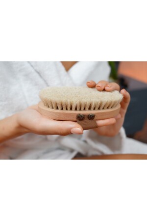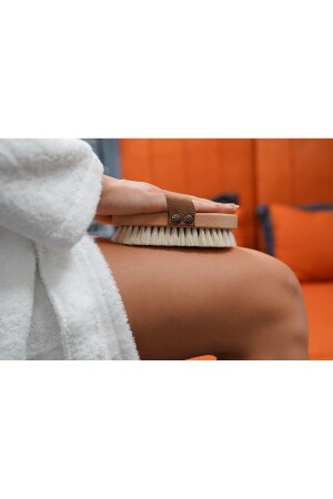 Die Cellulite-Bürste aus 100 % natürlichem Rosshaar wird mit Beutel und Box geliefert.