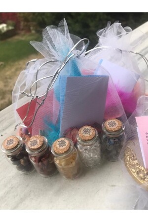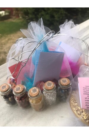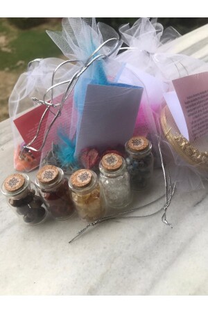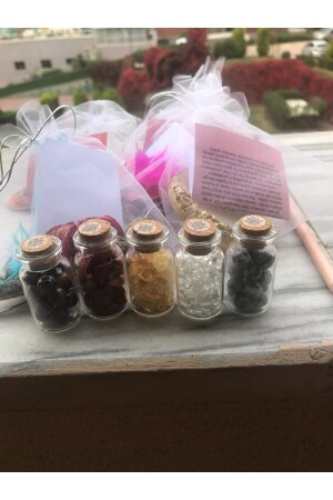 5 temel doğalı şifalı taş şişesinden oluşmaktadır . 1) Nazar negatif enerjiden koruma-(kaplangözü) 2) başarı- (dimotriot) 3) vazgeçilmezlik (kırmızı jasper) 4) para (Sitrin) ve 5) (beyaz kristal) gençlik güzellik bağışıklılık sistemi güçlendirmeye yardımcı doğal taş