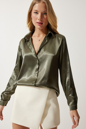 Dunkelkhakifarbenes, leicht drapiertes Satin-Oberflächenhemd für Damen DD00990