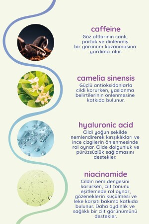 -. Göz altı torbaları ve cilt tonu farklılıklarını Yeşil çay ekstresi yardımı ile hedef alarak göz çevresini canlandırmayı ve içerdiği Hyaluronik Asit yardımı ile yaşlanma belirtilerini azaltarak daha genç ve dinamik bir görünüm sağlamayı amaçlamaktadır. Kafein ile zenginleştirilmiş formülü ile- aydınlık ve dinlenmiş bir görünüm elde etmenize yardımcı olur. Tüm cilt tiplerine uygundur. İçindekiler: Aqua- Glycerin- Caffeine- Niacinamide- Litchi chinensis Fruit Extract- Rosa canina Fruit Extract- Psidium guajava Fruit Extract- Ribes nigrum Fruit Extract- Camellia sinensis Leaf Extract- Hyaluronic Acid- Pentylene Glycol- Hydroxyethylcellulose- EDTA- Phenoxyethanol- Ethylhexylglycerin.
