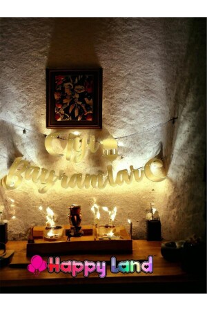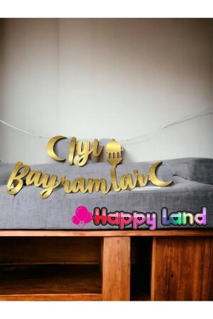 1 kalligrafischer, goldfarbener, metallisierter, glänzender „Happy Holidays“-Text. Unsere Produktabmessungen sind Breite: 20, Länge: 210 cm. Mit Hilfe des Seils im Inneren können Sie es überall aufhängen, wo Sie möchten. Ramadan-Dekorationen – werden verwendet, um Häuser oder Orte mit einer einzigartigen Atmosphäre für den Ramadan zu dekorieren. Happyland Ramadan-Dekorationsornamente