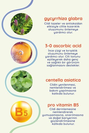 -. 3-O-Ethyl Ascorbic Acid içeren formulü ile- cilde aydınlık ve daha parlak bir görünüm kazandırır. Centella asiatica ve Arnica montana ekstreleri cildin yenilenmesine destek sağlar. Özel formulü ile cildin tonunu eşitlemeye yardımcı olur. Tüm cilt tiplerine uygundur. İçindekiler: Aqua- Panthenol- Glycerin- Pentylene Glycol- 3-O-Ethyl Ascorbic Acid- Camellia sinensis Leaf Extract- Calendula officinalis Flower Extract- Anthemis nobilis Flower Extract- Arnica montana Flower Extract- Persea gratissima Fruit Extract- Coffea arabica Seed Extract- Glycyrrhiza glabra Root extract- Centella asiatica Leaf Extract- Cucumis sativus Fruit Extract- Hyaluronic Acid- Hydroxyethylcellulose- EDTA- Phenoxyethanol- Ethylhexylglycerin.