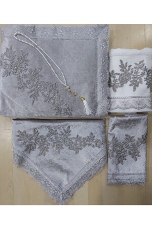Gri Kadife Seccade Takımı 5 Parça Çeyizlik Bohça Gelin Seti - Gri (KUTULU) 70*120 Cm