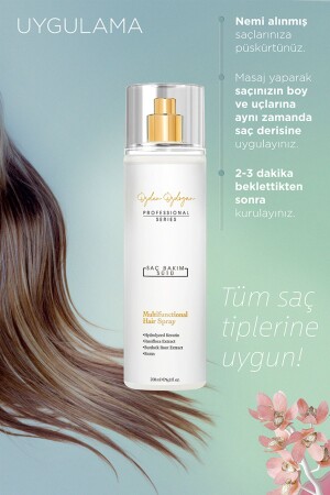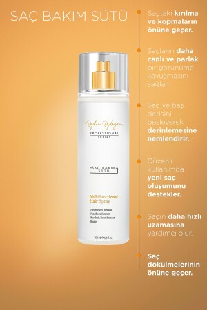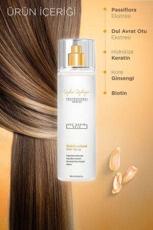 •Hydrolyzed Keratin- •Passiflora Extract- •Burdock Root Extract- •Biotin İçeriğindeki çarkıfelek bitki özü (passiflora) ekstresi- dulavrat otu (arctium majus) bitki özü ekstresi- hidrolize keratin ve biotin içeriği ile saçın daha canlı uzamasına yardımcı olur. Saç ve saç derisini besleyerek- derinlemesine nemlendirir. Saç dökülmelerinin- saçtaki kırılma ve kopmaların önüne geçer. Saçların daha parlak bir görünüme kavuşmasını sağlar. Kullanım Şekli: Nemi alınmış saçlarınıza eşit şekilde püskürtünüz. Masaj yaparak saçınızın boy ve uçlarına aynı zamanda saç derisine uygulayınız. 2-3 dakika beklettikten sonra kurulayınız. Tüm saç tipleri ve günlük kullanım için uygundur.