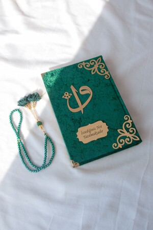 Hediyelik Kadife Kaplı Isme Özel Pleksi Desenli Arapça Orta Boy Kuranı Kerim Yeşil