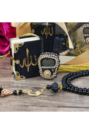 Hediyelik Mini Kur'an-ı Kerim & Lüks Taşlı Zikirmatik & İnci Tesbih Hediye Seti - Siyah - ikranur Kristal görünümlü renkli taşlar ile süslenmiştir. Dijital ekranlıdır. Her parmağa uyması için ayarlanabilir kelepçesi bulunmaktadır. 99.999 sayısına kadar sayabilir ve hafızasında tutabilir. Tavaf yaparken- yürürken- otobüste- arabada gizlice kullanabilirsiniz. Hac ve umre hediyesi- mevlüt hediyesi- kandil hediyesi- kutlu doğum hediyesi olarak verilebilir. * 1 adet mini Kur'an-ı Kerim ( 2-5 * 4-5 * 5-5 cm ölçülerinde )* 1 adet inci tesbih ( 99'lu)