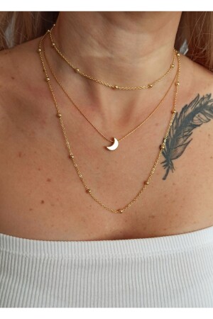 Hilal kolye gold kaplama zincire hilal figürü eklenmiştir- set 36-40-52 cm boylarında ve 3 cm uzatma zinciri mevcuttur. Kararmaya karşı özel kaplaması vardır- deniz suyu ve kozmetik ürünlerinden koruyarak hassas kullanım tavsiye edilir Ürün resimleri gün ışığında çekilmiş olup orijinal rengine en yakın seviyededir.