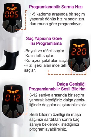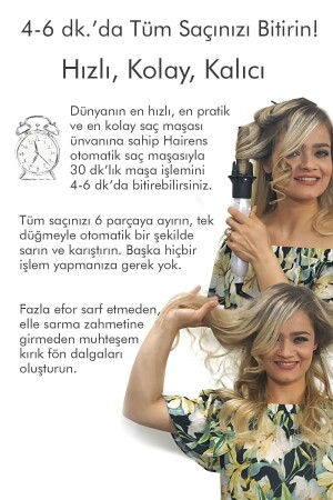-. Otomatik kapanma özelliği bulunan Hairens HRS su dalgası maşası- 220°C bandında yüksek ısı verir. Dönebilen kabloya sahip olan Hairens HRS-320 otomatik saç maşası- ayarlanabilir 5 kademeli ısısı sayesinde saç uygun derecenin kolayca seçilmesini sağlar. Hairens 25 mm saç maşası ile pratik şekilde su dalgası elde etmek mümkün olur. Hairens HRS-320 modelinde 120°C en düşük ısı ayarlanabilir olup cihazda sesli uyarı özelliği de bulunur. Koruma başlığı bulunan Hairens HRS-320 otomatik saç maşası 25mm modelinde kullanılan seramik turmalin kaplama- saçın kabarmasını ve elektriklenmesini engeller. Otomatik saç kıvırma özelliği bulunan Hairens seramik saç maşası modelinde bukle ve dalga elde etmek mümkündür. Hairens HRS-320 otomatik saç maşası- çift yöne dönebilen fırçası sayesinde istenen yönde kıvrımlar elde edilmesini sağlar. Hız ayarı ve zaman ayarı özellikleri bulunan saç şekillendiricide kalın su dalgası 25mm çapta kolayca elde edilir.