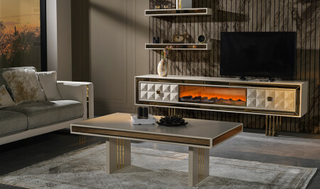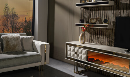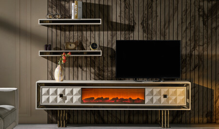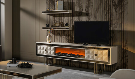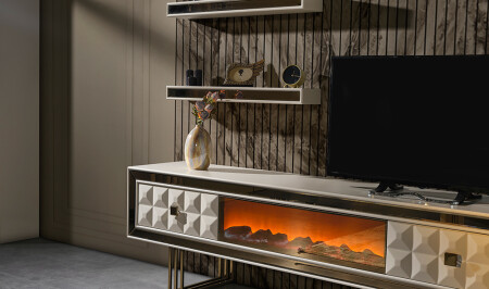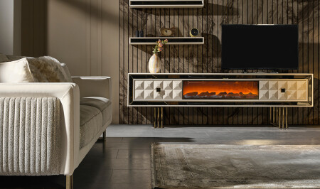 Çekmeceli, üst raflı ve şömine efektli tv ünitesi