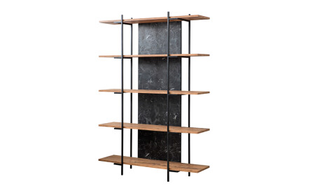 - Doğal ahşap kaplama ile ferforje profilin desteklediği modern ve naturel kitaplık modeli