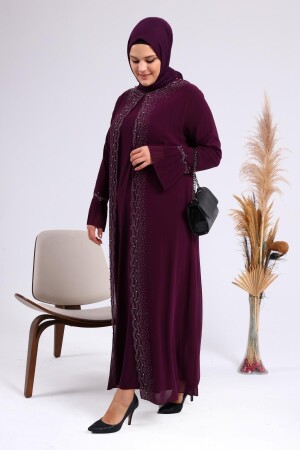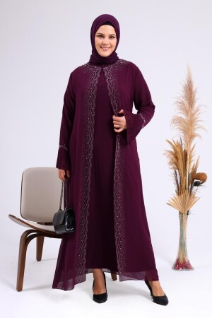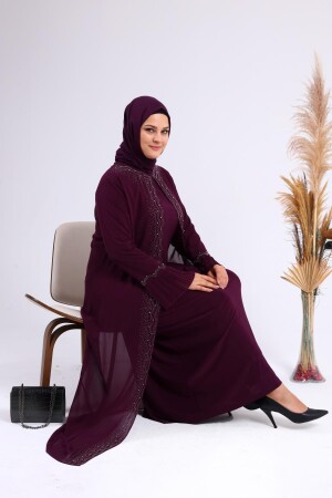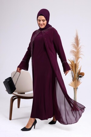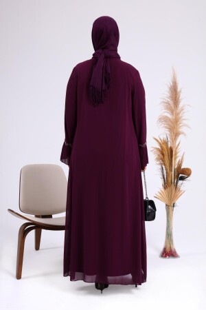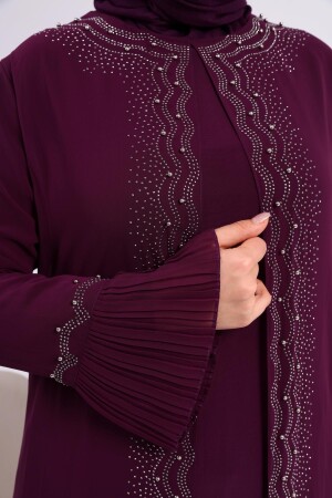 Unser großformatiger Hijab-Abendanzug für Mütter mit Strasssteinen und plissierten Ärmeln mit Perlenmuster hat eine Perlensteinstickerei auf Chiffon.