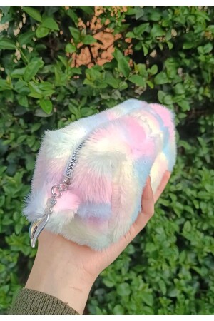 Kadın karışık renkli peluş kalemlik ve makyaj çantası