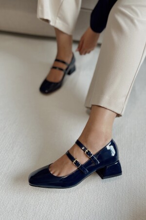 Es ist eine inländische Produktion und wird aus erstklassigem Lackledermaterial hergestellt. Die Absatzlänge beträgt 3 cm. Die Basis wird mit Polsterfüllung gestützt. Schuhe im Ballerina-Stil mit Blockabsatz und Riemen aus Lacklederimitat. Dünnes Band vorne. Quadratischer Zehen- und Handgelenkschnallenriemen