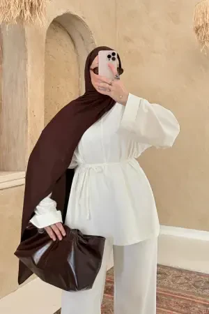 Geniş Kuşak Dolamalı Tesettür Tulum Bej