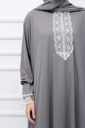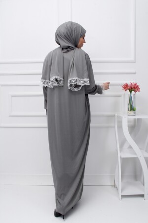 Kendinden BAŞÖRTÜLÜ ŞIK KADIN NAMAZ ELBİSESİ TÜRBAN ELBİSEYE DİKİŞLİ BİRLEŞİKTİR KOLLARI LASTIKLİ VE DANTEL İŞLEMELİDİR YAKA KISMINDA ŞIK DANTEL BULUNUR İÇ GÖSTERMEZ 30 DERECEDE YIKANMASI ÖNERİLİR HAFİF KUMAŞTIR KOLAYCA CANTAYA SIĞABİLİR MANKEN BEDENİ M BEDENDİR 56 KG DİR ELBİSE BOYU 145 CM DİR