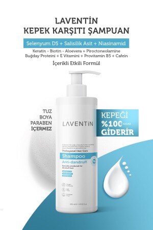 Laventin 11 Aktives Anti-Schuppen-Shampoo ohne Salz, 400 ml. Verwendungszweck: Laventin Anti-Schuppen-Shampoo ist für Schuppen und wiederkehrende Schuppen geeignet. Produktvorteil: Laventin Anti-Dandruff Advanced Effective Shampoo 400 ml – entfernt 100 % der sichtbaren Schuppen in nur zwei Wochen. Dieses fortschrittliche Aktionsshampoo mit Selenium DSli Microbiome Technology – wirkt wirksam gegen Schuppen und lindert den Juckreiz ab der ersten Anwendung. Klinische Studien zeigen eine wiederkehrende Wirkung über 6 Wochen. Es enthält kein Paraben. Der neue Duft wurde dermatologisch getestet. So verwenden Sie Laventin Anti-Schuppen-Shampoo für Haare: Tragen Sie es bei der ersten Anwendung auf Ihr Haar auf, lassen Sie es 2 Minuten einwirken und spülen Sie es aus. Zur weiteren Anwendung durch Massieren auftragen und abspülen. 4-Wochen-Programm Kontakt mit Augen und Haut vermeiden. Bei Kontakt mit den Augen mit viel Wasser waschen. Enthält kein Salz. Es wurde dermatologisch getestet und ist im Produktverfolgungssystem des Gesundheitsministeriums mit der Barcodenummer 8683649154802 registriert. Keines der Produkte unseres Unternehmens wurde und wird an Tieren getestet. Highlights des Inhalts von Laventin 11 -Aktives Anti-Schuppen-Shampoo: Selenium Ds Niacinamid Keratin- Biotin Aloevera Vitamin E Salicylsäure Pyroctoneolamin Weizenprotein Pro Vitamin B5 Koffein