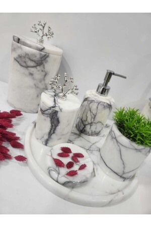 Es besteht aus 1 Marmortablett + 1 Marmor-Festseifenspender + 1 Marmor-Flüssigseifenspender + 1 Marmor-Zahnbürstenhalter + 1 Marmor-Baumwollschüssel mit Deckel + 1 Marmor-Abfallbehälter mit Deckel + 1 Marmor-Toilettenbürstenhalter. Marmormaterialien eignen sich für eine dauerhafte Nutzung. Zubehörteile sind aus erstklassigem Material gefertigt. ES VERURSACHT KEINE VERFÄRBUNGEN, DUNKELHEIT ODER VERBLEIBEN.