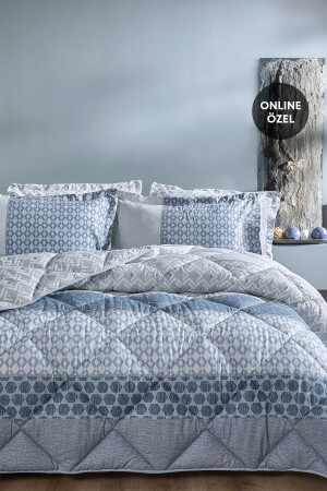 Şık geometrik desenleriyle modern ve dinamik bir tarza sahip Malin Uyku Seti- görsel zenginliğini pratik kullanım avantajıyla buluşturuyor. Pamuk Kalitesi Desenli Çift Taraflı Kullanım Dolgu Gramajı : 300 gr/m2 %100 Pamuk Ürün İçeriği ve Ölçü Bilgisi : Yorgan: 155x215 cm (1 Adet) Düz Çarşaf: 180x240 cm (1 Adet) Volanlı Yastık Kılıfı: 50x70 cm (1 Adet) Yıkama Talimatı : 40 derecede yıkanması tavsiye edilir Ağartma yapılmamalıdır Ütülenmesi tavsiye edilmez Orta ısıda ütülenebilir (Max 150°) Tamburlu kurutma yapılmamalıdır Kuru temizleme uygulanmamalıdır Benzer renklerle yıkanması tavsiye edilir Çarşaf: 30 derecede yıkanması tavsiye edilir Ağartma yapılmamalıdır Orta ısıda ütülenebilir (Max 150°) Tamburlu kurutma yapılmamalıdır Kuru temizleme uygulanmamalıdır