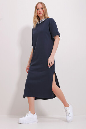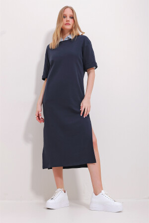 Marineblaues Damenkleid mit Rundhalsausschnitt, doppelten Ärmeln und Schlitz ALC-X11485