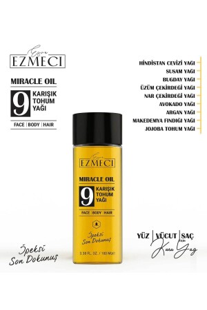 Çok Amaçlı Kuru Yağ (Yüz- Vücut- Saç) 9 değerli bitkisel yağ içeren efsanevi bakım- yüzünüzde ve vücudunuzda cildiniz için uzun süreli nemlenme sağlar. Eşsiz kuru yağ dokusu- sıcak ve şehvetli notalarla bağımlılık yaratan kokusu sayesinde Miracle Oil gerçek bir zevk anı sağlar. Miracle Oil kuru yağı yaz kış fark etmeksizin tüm yıl boyunca yüzünüzde- vücudunuzda ve saçlarınızda kullanabilirsiniz. Yüzünüze uygularken yumuşak hareketlerle yüzünüzün ortasından dış bölgelere doğru uygulayın. Vücudunuza uygularken dairesel hareketlerle (göğüs ve bacak bölgesine) ve çatlak izlerinin üzerine uygulayın. Saça uygularken- saç dibine getirmeden ve saç uçlarınıza ihtiyaç duyduğunuz sıklıkta uygulayın. Yoğun bakım etkisi için haftada bir veya iki kez şampuanlamadan önce 10 dakika kadar maske olarak uygulanır.