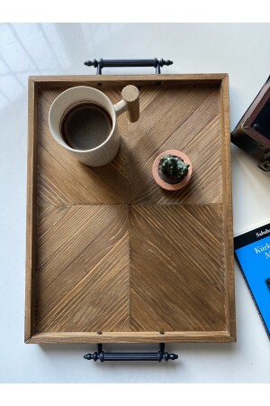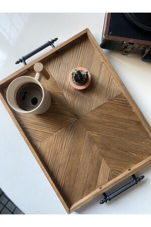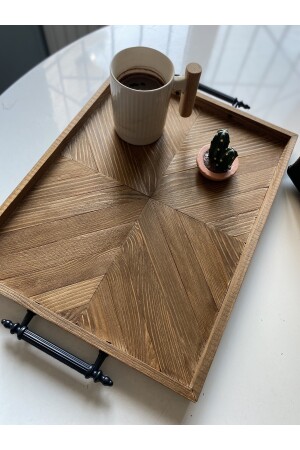 3 Lü (51- 37- 30 CM) Ahşap Kulplu Metal Tepsi Çay Tepsisi Kahve Tepsisi Sunum Tepsi Seti