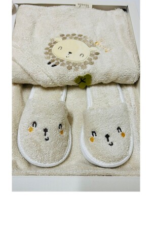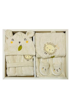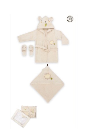 مجموعة حمام الحمل البالغ من العمر 0-3 سنوات. هي مجموعة تتكون من حمام الحمام والمنشفة والحذاء. مصنوعة من القطن 100%. لا تحتوي على مواد مسررة