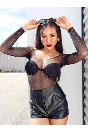 كريستال MNZ-Crystal Shiny Stone Mesh Body Blouse حجم قياسي يصل إلى XS-S-M-L-XL بفضل هيكلها المرن. لا يوجد سقوط للح