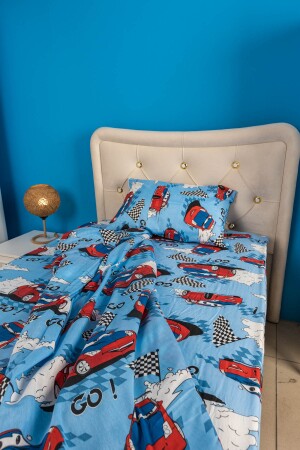 Rally Yarış Arabalı Desenli Mavi Çarşaflı 2 Yastık Kılıflı -Ranforce Tek Kişilik Nevresim Takımı