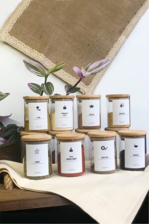 12'li Kapağı Kendinden Kaşıklı Ve Etiketli Baharatlık Seti 300 ml Gold Etiketli Cam Baharat Takımı