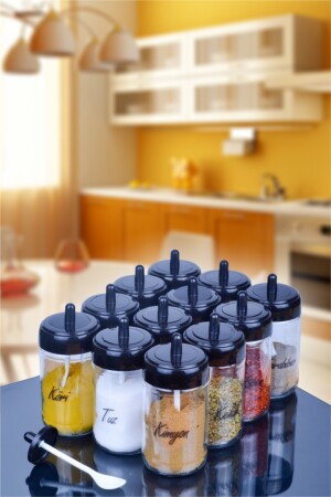 12'li Kapağı Kendinden Kaşıklı Ve Etiketli Baharatlık Seti 300 ml Gold Etiketli Cam Baharat Takımı