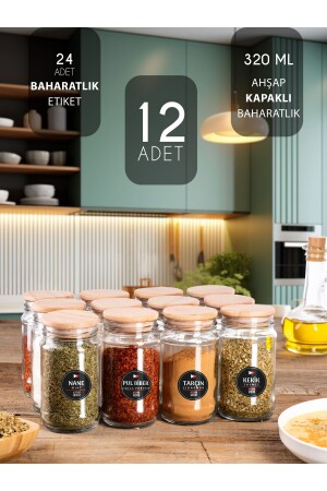 12'li Kapağı Kendinden Kaşıklı Ve Etiketli Baharatlık Seti 300 ml Gold Etiketli Cam Baharat Takımı