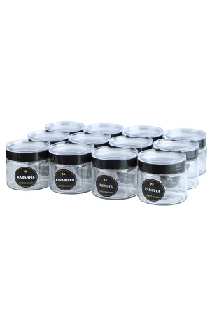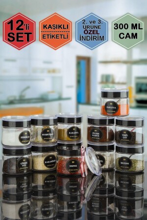 12'li Kapağı Kendinden Kaşıklı Ve Etiketli Baharatlık Seti 300 ml Gold Etiketli Cam Baharat Takımı