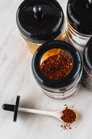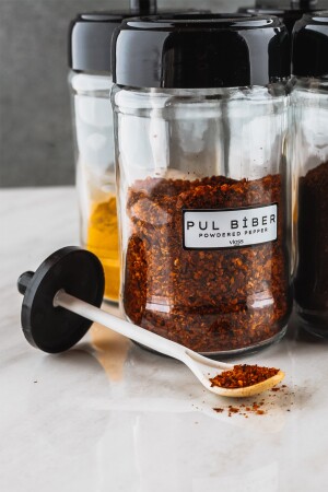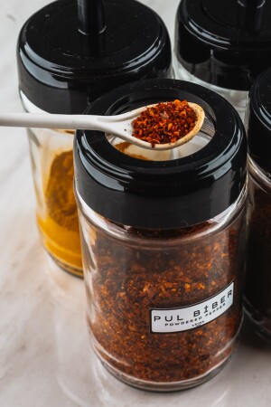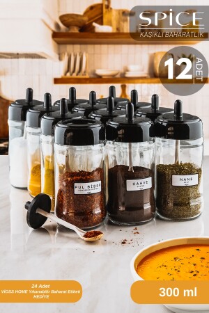 12'li Kapağı Kendinden Kaşıklı Ve Etiketli Baharatlık Seti 300 ml Gold Etiketli Cam Baharat Takımı