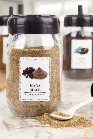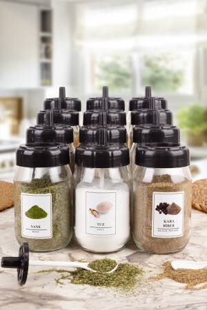 12'li Kapağı Kendinden Kaşıklı Ve Etiketli Baharatlık Seti 300 ml Gold Etiketli Cam Baharat Takımı