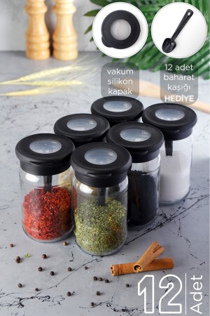 12'li Kapağı Kendinden Kaşıklı Ve Etiketli Baharatlık Seti 300 ml Gold Etiketli Cam Baharat Takımı