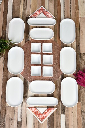 مادة من المواد: السيراميك 6 لوحات خدمة (23x13 سم) 2 وعاءات خدمة (20x17 سم) 2 وعاءات زيتون (24x6 سم) 6 وعاءات خدمة